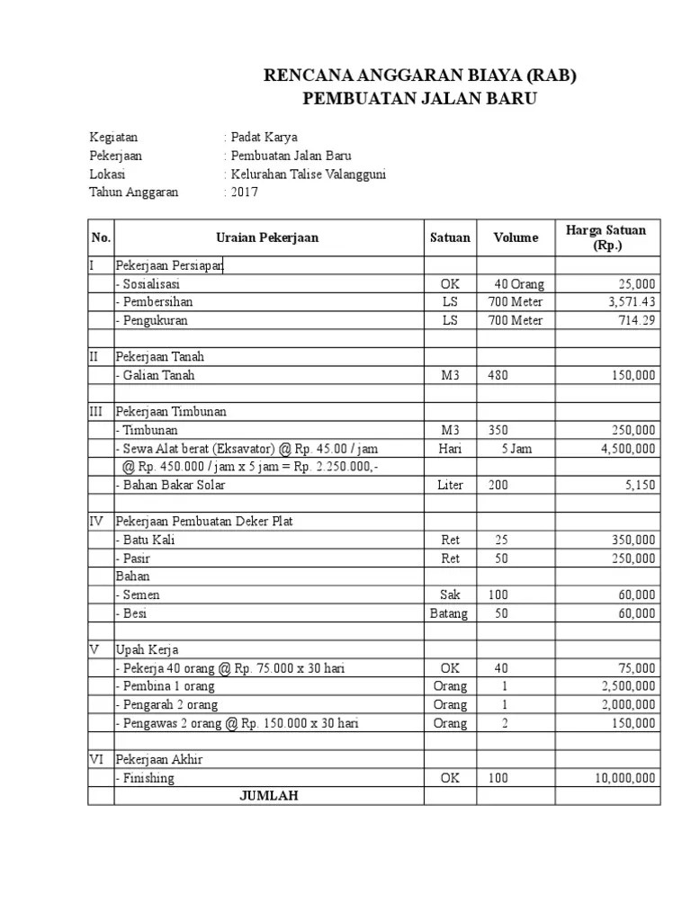 Comdownload rab jalan beton excel/ rigid pavement excel master rab jalan. Download file kumpulan metode pelaksanaan dokumen. Contoh rencana anggaran biaya (rab).xlsx. Contoh dokumen rab xls / unggah file rencana anggaran biaya rab panduan pkp untuk admin dinas kota kabupaten dan provinsi / aplikasi rab . Mau download contoh format rab (rencana anggaran biaya) penghasilan tetap (siltap) dan tunjangan kepala desa dalam bentuk excel (xls) terbaru?